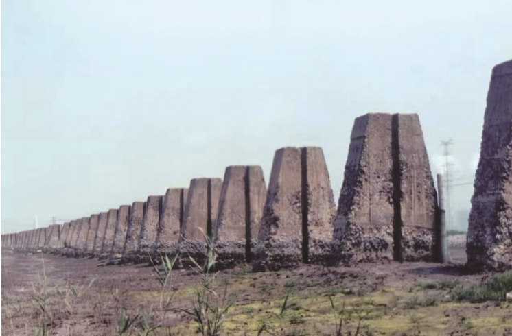 挡浪墙建于1905年的垦牧初期,全长1581米,初为土堤,后有土墙、板墙和水泥墩墙三种结构,至1941年共长1479米(其中土堤7段长495米,板堤3段540米,水泥墩堤2段长444米)。多少年来,海龙王始终斗不过状元公,挡浪墙似海上钢铁长城,把海潮牢牢地挡在外面,有效地保护了堤内土地和百姓生命财产的安全。近年由于海岸线的变迁东移,挡浪墙已没有海潮可挡,但它仍顽强地伫立在那里。2020年4月,本人实地丈量残墙,只有455米(其中板堤42跨,长206米,墩堤105座,长249米,土堤已消失)。