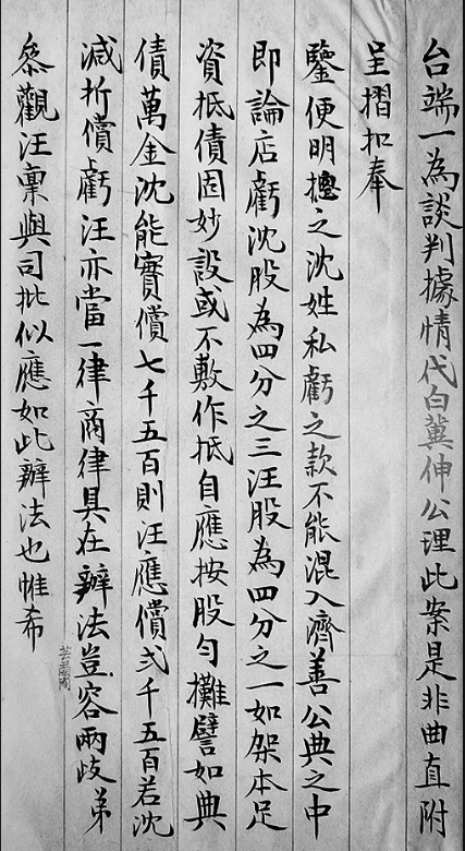 久不奉教,驰系为劳,惟德望日隆,兴居佳胜为颂。顷据皖友来函云,常州汪承祖君以典债轇轕,其弟翰章冤被江阴令管押,由沈子培方伯函请瑞心儒方伯酌核案情,秉公办理,饬将翰章开释,并据苏省各钱庄控,蒙批饬苏府调齐县卷,会同苏商务总会秉公裁判等情,属为转致台端,一为谈判据情代白,冀伸公理,此案是非曲直,附呈折扣,奉鉴便明。总之,沈姓私亏之款,不能混入济善公典之中,即论店亏,沈股为四分之三,汪股为四分之一,如架本足资抵债固妙,设或不敷作抵,自应按股匀摊;如典债万金,沈能实偿七千五百,则汪应偿二千五百;若沈减折偿亏,汪亦当一律。商律俱在,办法岂容两歧。弟参观汪禀与司批,似应如此办法也。惟希卓裁。专肃,敬请勋安!