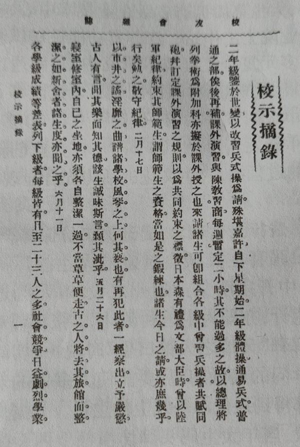 二年级鉴于世变,以改习兵式操为请,殊堪嘉许。自下星期始,二年级体操,通易兵式。普通之部,俟后再补。课外演习,与陈教练习商,每周暂定二小时。其不能过多之故,以总理将列拳术为附加科,亦拟于课外授之也。来请诸生,可即组合各级中曾习兵操者,共赋同袍,并订立课外演习之规则,以为共同约束之标徵。日本森有礼为文部大臣时,曾以陆军纪律,约束其师范生,谓师范生之资格,当如是之锻炼也。诸生今日之请,或亦庶几乎?行矣勉之,敬守纪律!(二月十七日)