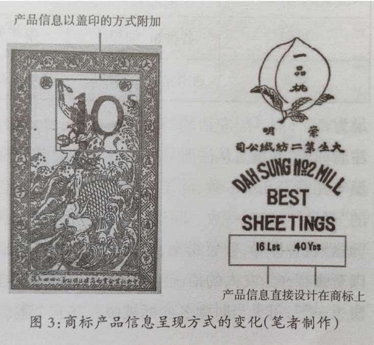 除此之外,大生纱厂的注册商标不仅严格依据商标法的类目进行区分,且根据棉纱、棉布等种类和质量分别标记,更有联合注册商标的使用。从商标设计功能来看,产品商标一开始需要专人负责“盖号戳”以区分支数,后来则将相关产品的信息直接设计在了商标中,这一改良无疑具有现代意义。在商标使用过程中,通过具体实践不仅减少了一道包装工序、提高了包装效率,又使商标设计的形式和功能得到了进一步优化(图3)。