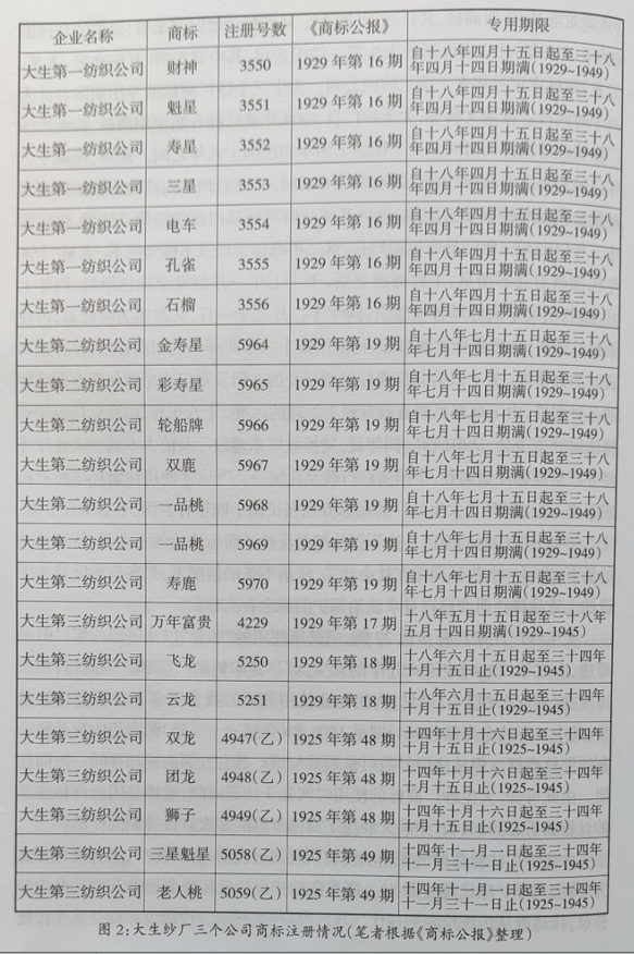 笔者查阅了北洋政府刊印的《商标公报》中关于大生三个纺织公司的注册商标,并通过其申请号数、注册号数及所刊期数进行整理,以推证其商标注册的相关情况:大生第一纺纱有限公司(南通唐闸)的注册商标,共计七例;大生第二纺纱有限公司(崇明外沙九隆镇)的注册商标,共计七例;大生第三纺织有限公司(青龙港)的注册商标,共计八例(图2)。从商标注册时间来看,最晚的是民国四年(1915年)才立案注册的大生第三纺织公司,其中有三例(万年富贵、飞龙、云龙)商标审定号却先于第二纺织公司。大生三个纱厂商标的专用期限共计为六个时间段。据前文所证,大生纱厂自1904年就已经开始使用商标,而大生纱厂呈请注册商标的时间却介于民国十四年和民国十八年之间。原来,民国十二年(1923)是北洋政府《商标法》对外颁布的时间,此后两年内该商标法依旧遭到外国公使及外商的多方阻挠,外加北洋政府商标局内部组织调动频繁,仅民国十三年(1924)一年四易商标局局长,这使得商标管理效率极为低下。直至“十六年民国政府迁都南京,工商部成立后,于十七年一月创设全国注册局,同年七月,接收前北京商标局各项卷宗,同年十二月二十一日,又改组为商标局,内设商标注册科,办理商标注册事项,仍沿用民十二年所颁布的旧商标法;并在上海设驻沪办事处。关于以前北京商标局所接受的注册及审定或呈请注册有据可凭的各种案件,由工商部另颁查验章程为处理的标准。十八年春,由商标局组织商标法研究委员会,从事研究。同年夏,复接收广东建设厅及前大本营暨实业厅等经办广东商标注册案卷,全国商标行政至此统一。”15这才使得注册环境相对稳定下来。这也揭开了大生纱厂的商标分别在民国十四年有五例、十七年有十例、十八年有七例注册的原因。这不仅从侧面反映了商标法治的不完善、管理效率的低下,也再一次佐证即便在社会动荡、法治不备的情况下,张謇依然坚持为创设的土货品牌注册商标以寻求法治保护的观念和决心。