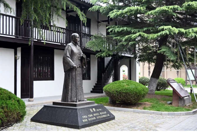 敦裕堂遗存“七楼七底”建筑前的张謇雕像。(摄影/梓童)