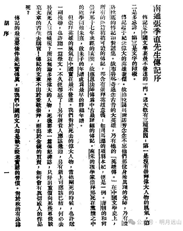 这是一篇阐发胡适关于历史人物传记的重要理论文章,我们在序言中读到的是胡适关于中国两千年传记文学的批评、用“新传记体”来记载近代重要人物希望、对张謇的评价以及对张孝若“爱的工作”的肯定。虽然,胡适当时还没有看到传记的全文,但是近半年来对张孝若作传的指导、交流,已经让他对这部作品有了较充分的了解。所以这篇序言让张孝若感到“铭刻心骨”,“给这本书以无上光荣”。胡适也相当看重他的这篇序言,先发表在1930年1月《吴淞月刊》第4期,后于9月将其编入了《胡适文存》第三集,成为他关于历史人物评价以及历史传记写作的重要理论文章。