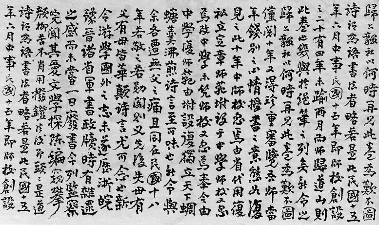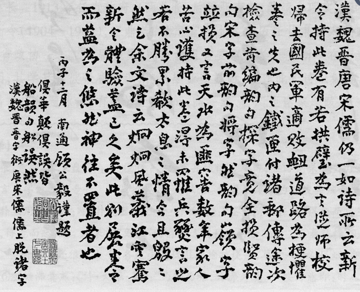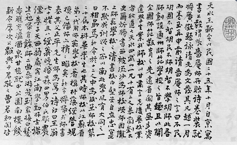 天水王生新令,以民国二十五年十月自京(南京——引者)寓书公毅,谓啬师前贻诗卷装就,将广征题咏,请先为文发其凡。越一月,卷至,申前请。啬庵师之言曰:“不民胡国?不智胡民?不学胡智?不师胡学?”此吾师创设师范学校之旨趣,且以开全国师范教育之先。远省闻其风,多资遣学生业我师校。以甘肃言,先后毕校业者,狄道七,天水四,武山一,凡十有二人。皋兰刘太史尔炘榜书“西被流沙”为师校颂。师应陇上师范学校之请,书校内“坚苦自立,忠实不欺”成训赠之,而以南北学风有大同之一日相勖焉。新令于十二人中为后至,师校第二十届本科毕业生也。其时师校以江苏省第一代用师范学校著称,经营村落历三十年,师亦稍稍暇矣。新令将归,求师书奉其父正平先生。师为写一诗,诗曰:“王翁七十姥五八,经义晚婚森四男。伯氏服农儒季子,天西弱岁客江南。学勤好古诸生冠,归有余师二曲参。游笈到家嬉白发,寿觞充溢酒泉甘。”旋就中公园南楼饯新令,席次,公毅与于君敬之、曹君勋阁、王君辛伯皆先新令。师曰:“新令之师应先,为新令行,余将首进之酒。”师尝谓教育当养成有礼法、不苟简之人,故所次若是欤?师即席诏新令者,恳切周详。新令为鼓琴适然亭上,师闻之,掀髯而笑。明日贻新令长句,即此诗卷。当诏新令时,有云:“文章有一定之气运,文在唐必变,惟昌黎足以承之。初学文或诗,不厌摹仿;摹仿既熟,自不难进而辟一新路,成一格局,至此则陈言可去而词由己出矣。此种意境非好学深思不能知之。”诗谓“为语文法”者略若是。又云:“字须一笔一画有着落,注意常人所易忽略处,从平正方面用力,尤须多玩味古人。今人于篆隶多推邓完白,不知何子贞实驾而上之。何读书多,邓读书少;一则士气,一则将气。”又云:“执笔用拨镫法,写碑帖皆宜。曩摹颜柳苦不肖,用拨镫法后即头头是道。”诗“为语书法”者略若是。此民国十五年六月事,民国十五年即师校创设之二十有四年。未逾两月而师归道山,则此卷也,几于绝笔之列矣。新令之归,公毅私以何时再见此卷为叹,不图仅阅十年,又得珍重审览。吾师当年饯别之心情,授书之神态,如复见之。此十年中,师校忽焉由省代用复私立。定章,师范附设中学,师校又忽焉称中学。未几,师校又忽焉奉令复师范由附设复独立。“天下蜩螗羹复煎”,诗言至可味也。新令与余各遭无父之痛,且同在民国十八年,若敬之、若勋阁则又先后失母。“有父有母俱华颠”,诗言尤可念也。新令游学国外之志未遂,历浙皖豫晋青海诸省,军书政牍,时有杂遝之感,而未尝一日废书。今列监察院,闻其爱文学,探新编,窥摩汉魏唐宋诸儒,仍一如诗所云。新令持此卷若拱璧,为言从师校归去,国民军败衄,道路为梗。惧此卷之失也,内之铁匣,付诸邮传。途次检查苛,编韵句“探字”竟全损,贤韵句“宋”字、前韵句“将”字,船韵句“岭”字并损。又言天水为匪窖数年,家人苦心护持,此卷得未罹兵燹,言之不胜累欷太息之情。今又殷殷然乞余文。诗云“炯炯风义江云骞”,新令体验盖已久矣,此则展卷而益为之悠然神往不置者也。