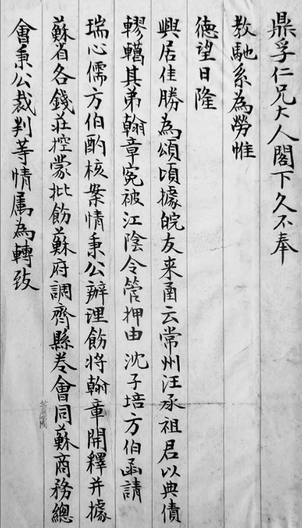 久不奉教,驰系为劳,惟德望日隆,兴居佳胜为颂。顷据皖友来函云,常州汪承祖君以典债轇轕,其弟翰章冤被江阴令管押,由沈子培方伯函请瑞心儒方伯酌核案情,秉公办理,饬将翰章开释,并据苏省各钱庄控,蒙批饬苏府调齐县卷,会同苏商务总会秉公裁判等情,属为转致台端,一为谈判据情代白,冀伸公理,此案是非曲直,附呈折扣,奉鉴便明。总之,沈姓私亏之款,不能混入济善公典之中,即论店亏,沈股为四分之三,汪股为四分之一,如架本足资抵债固妙,设或不敷作抵,自应按股匀摊;如典债万金,沈能实偿七千五百,则汪应偿二千五百;若沈减折偿亏,汪亦当一律。商律俱在,办法岂容两歧。弟参观汪禀与司批,似应如此办法也。惟希卓裁。专肃,敬请勋安!