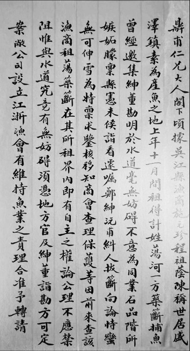 顷据吴江县渔商施元珍、程祖荫陈称,世居盛泽镇,素为产鱼之地,上年十一月间,租得计姓荡河一方,筑簖捕鱼,曾经邀集绅董,勘明于水道毫无妨碍,不意为同业石品阶所嫉妬,朦禀县宪,未候诣看,遽嘱郑绅沅甫纠人拔簖,向论恃蛮,无可伸雪,为特禀求鉴核,移知商会查理、保护等因前来。查该渔商租荡筑簖,在其所租界内,即有自主之权,论公理不应禁阻。惟与水道究竟有无妨碍,须凭地方官及绅董诣勘,方可定案。敝公司设立江浙渔会,有维持鱼业之责,理合准予转请尊处移知江震商会,立即邀集公正绅董前去会勘,秉公理明,以释讼端而安渔业。实纫公谊,专泐。敬请台安!