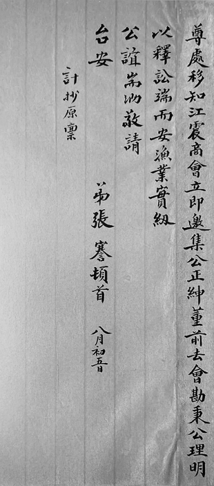 史载光绪三十一年(1905)四月,张謇创办江浙渔业公司,“同时江浙渔会成立,附设于渔业公司之内。因渔商来自海外,未谙会务,亦托张謇兼管,初尚亲理其事,继则诿权他人。”[7]可见,张謇收信后即致函尤鼎孚,系其职责所在。根据施、程二商的陈称,张謇先在信中简述了事情经过,继则强调“与水道究竟有无妨碍,须凭地方官及绅董诣勘,方可定案”,并申明“敝公司设立江浙渔会,有维持鱼业之责”,为此敦请尤鼎孚“立即邀集公正绅董前去会勘,秉公理明,以释讼端而安渔业”。鲜明表达了其公正客观的态度与“释讼端”“安渔业”的期待。