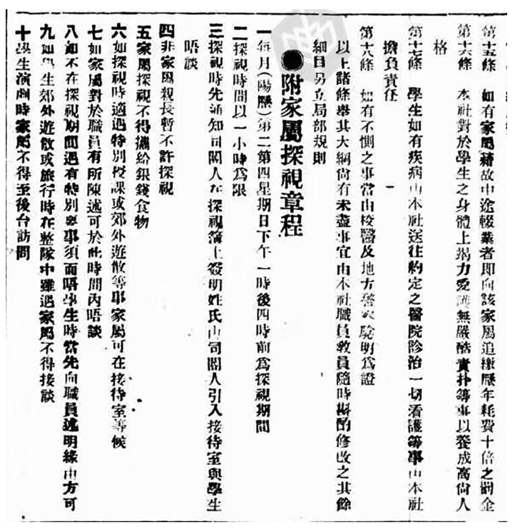 八、如不在探视期间,遇有特别要事须面晤学生时,当先向职员述明缘由方可。